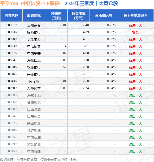从基金规模来看,平安MSCI中国A股ETF联接C基金2024年三季度公布的基金规模为0.4亿元,较上一期规模3662.09万元变化了303.44万元,环比变化了8.29%。该基金最新一期资产配置为:股票占净值比2.87%,债券占净值比2.8%,现金占净值比3.86%。从基金持仓来看,该基金当季前十大股票仓位达0.71%,第一大重仓股为贵州茅台(600519),持仓占比为0.25%。