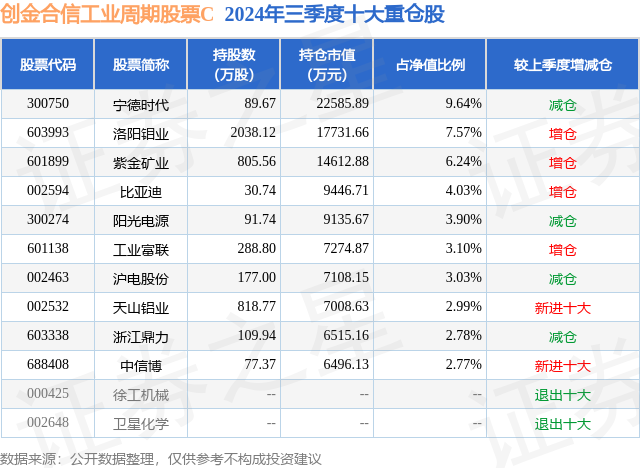 从基金规模来看,创金合信工业周期股票C基金2024年三季度公布的基金规模为8.33亿元,较上一期规模7.85亿元变化了4877.02万元,环比变化了6.22%。该基金最新一期资产配置为:股票占净值比93.73%,无债券类资产,现金占净值比7.66%。从基金持仓来看,该基金当季前十大股票仓位达46.05%,第一大重仓股为宁德时代(300750),持仓占比为9.64%。