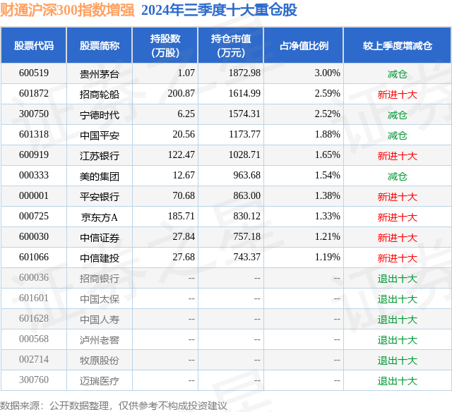 从基金规模来看,财通沪深300指数增强基金2024年三季度公布的基金规模为6.25亿元,较上一期规模6.1亿元变化了1482.3万元,环比变化了2.43%。该基金最新一期资产配置为:股票占净值比91.21%,无债券类资产,现金占净值比9.63%。从基金持仓来看,该基金当季前十大股票仓位达18.29%,第一大重仓股为贵州茅台(600519),持仓占比为3.0%。