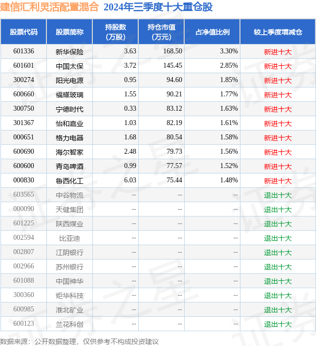 从基金规模来看,建信汇利灵活配置混合基金2024年三季度公布的基金规模为0.51亿元,较上一期规模4865.08万元变化了238.37万元,环比变化了4.9%。该基金最新一期资产配置为:股票占净值比92.02%,无债券类资产,现金占净值比14.27%。从基金持仓来看,该基金当季前十大股票仓位达19.15%,第一大重仓股为新华保险(601336),持仓占比为3.3%。