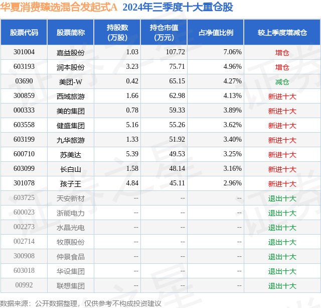 从基金规模来看,华夏消费臻选混合发起式A基金2024年三季度公布的基金规模为0.13亿元,较上一期规模1151.97万元变化了146.48万元,环比变化了12.72%。该基金最新一期资产配置为:股票占净值比89.44%,无债券类资产,现金占净值比13.1%。从基金持仓来看,该基金当季前十大股票仓位达40.7%,第一大重仓股为嘉益股份(301004),持仓占比为7.06%。