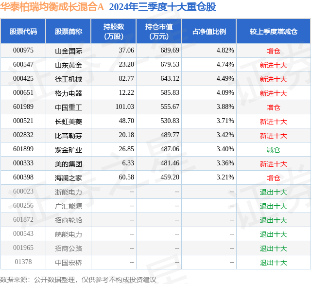 从基金规模来看,华泰柏瑞均衡成长混合A基金2024年三季度公布的基金规模为0.84亿元,较上一期规模8609.26万元变化了-201.93万元,环比变化了-2.35%。该基金最新一期资产配置为:股票占净值比93.86%,无债券类资产,现金占净值比6.62%。从基金持仓来看,该基金当季前十大股票仓位达39.12%,第一大重仓股为山金国际(000975),持仓占比为4.82%。