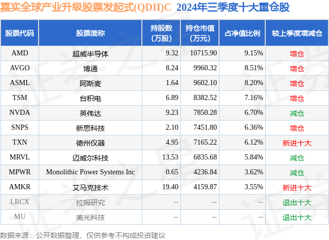 从基金规模来看,嘉实全球产业升级股票发起式(QDII)C基金2024年三季度公布的基金规模为8.23亿元,较上一期规模8.07亿元变化了1590.42万元,环比变化了1.97%。该基金最新一期资产配置为:股票占净值比81.11%,债券占净值比5.26%,现金占净值比3.81%。从基金持仓来看,该基金当季前十大股票仓位达65.21%,第一大重仓股为超威半导体(AMD),持仓占比为9.15%。