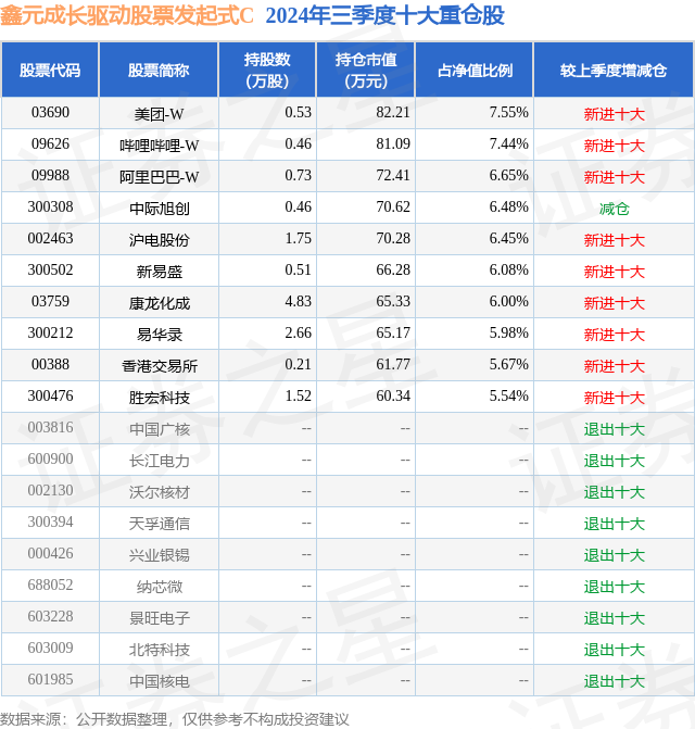 从基金规模来看,鑫元成长驱动股票发起式C基金2024年三季度公布的基金规模为0.02亿元,较上一期规模255.31万元变化了-14.34万元,环比变化了-5.62%。该基金最新一期资产配置为:股票占净值比89.62%,债券占净值比5.6%,现金占净值比13.12%。从基金持仓来看,该基金当季前十大股票仓位达63.84%,第一大重仓股为美团-W(03690),持仓占比为7.55%。
