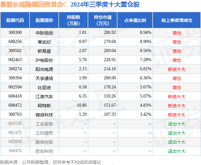 从基金规模来看,景顺长城稳健回报混合C基金2024年三季度公布的基金规模为0.27亿元,较上一期规模1163.92万元变化了1487.6万元,环比变化了127.81%。该基金最新一期资产配置为:股票占净值比89.03%,债券占净值比4.85%,现金占净值比2.13%。从基金持仓来看,该基金当季前十大股票仓位达65.84%,第一大重仓股为中际旭创(300308),持仓占比为8.94%。