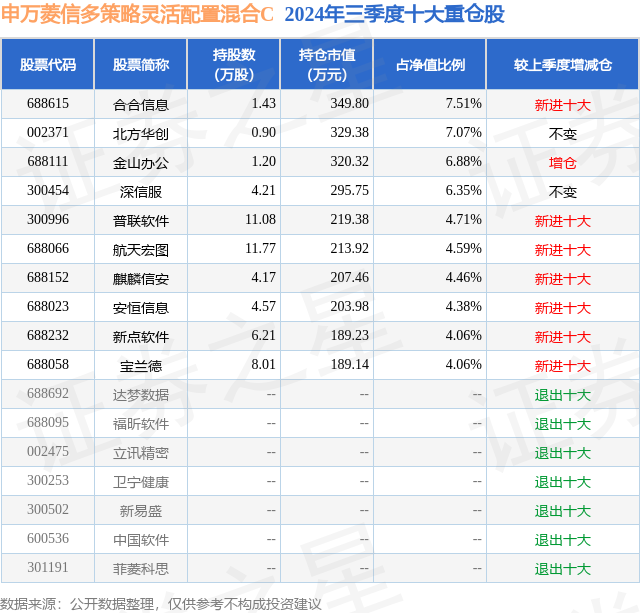 证券之星消息,日前申万菱信多策略灵活配置混合C基金公布三季报,2024年三季度最新规模0.41亿元,季度净值涨幅为27.93%。