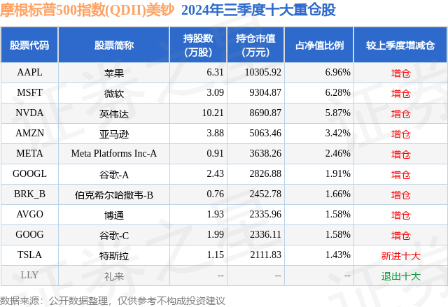 从基金规模来看,摩根标普500指数(QDII)美钞基金2024年三季度公布的基金规模为10.38亿元,较上一期规模8.91亿元变化了1.47亿元,环比变化了16.51%。该基金最新一期资产配置为:股票占净值比94.52%,无债券类资产,现金占净值比7.81%。从基金持仓来看,该基金当季前十大股票仓位达33.15%,第一大重仓股为苹果(AAPL),持仓占比为6.96%。