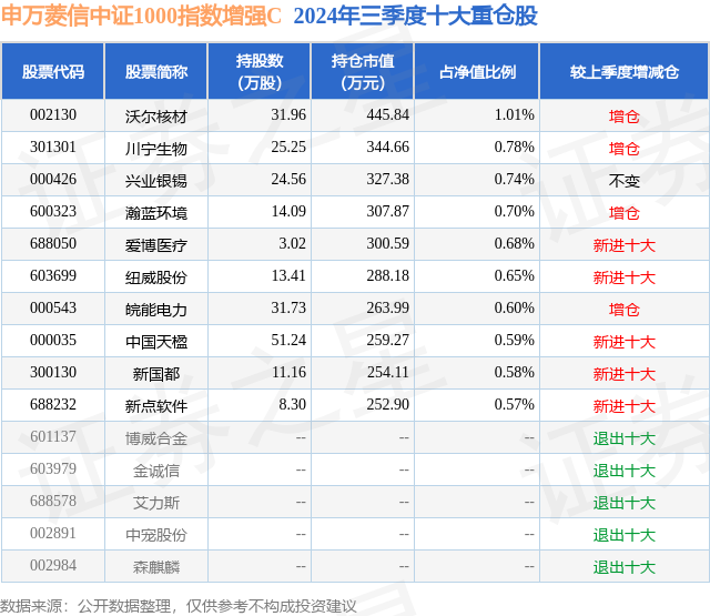 证券之星消息,日前申万菱信中证1000指数增强C基金公布三季报,2024年三季度最新规模1.14亿元,季度净值涨幅为12.35%。