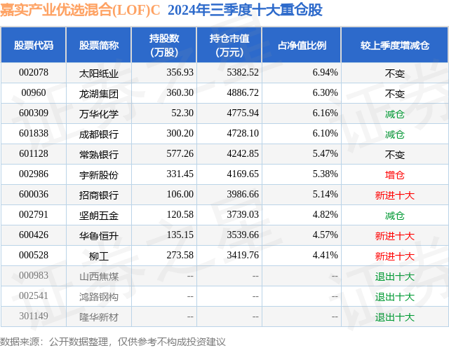 从基金规模来看,嘉实产业优选混合(LOF)C基金2024年三季度公布的基金规模为0.01亿元,较上一期规模432.78万元变化了-336.63万元,环比变化了-77.78%。该基金最新一期资产配置为:股票占净值比88.32%,债券占净值比4.87%,现金占净值比8.49%。从基金持仓来看,该基金当季前十大股票仓位达55.29%,第一大重仓股为太阳纸业(002078),持仓占比为6.94%。