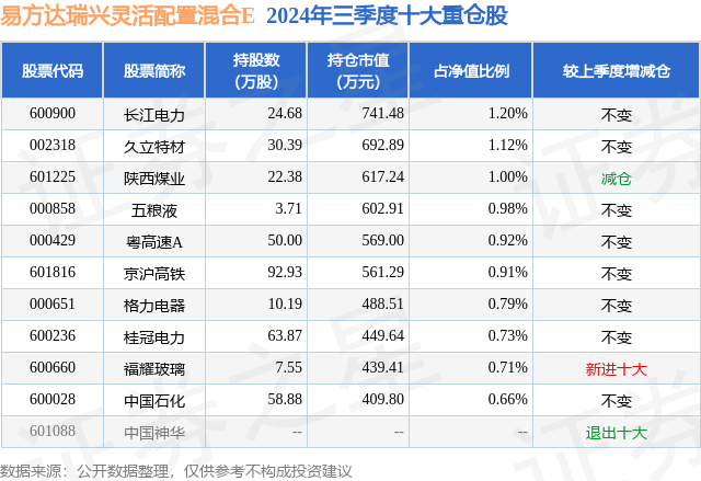 从基金规模来看,易方达瑞兴灵活配置混合E基金2024年三季度公布的基金规模为2.28亿元,较上一期规模2.82亿元变化了-5466.79万元,环比变化了-19.37%。该基金最新一期资产配置为:股票占净值比22.53%,债券占净值比110.04%,现金占净值比2.0%。从基金持仓来看,该基金当季前十大股票仓位达9.02%,第一大重仓股为长江电力(600900),持仓占比为1.2%。