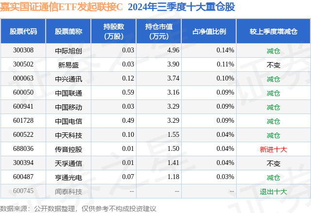 从基金规模来看,嘉实国证通信ETF发起联接C基金2024年三季度公布的基金规模为0.21亿元,较上一期规模2417.16万元变化了-340.14万元,环比变化了-14.07%。该基金最新一期资产配置为:股票占净值比1.27%,无债券类资产,现金占净值比5.98%。从基金持仓来看,该基金当季前十大股票仓位达0.77%,第一大重仓股为中际旭创(300308),持仓占比为0.14%。