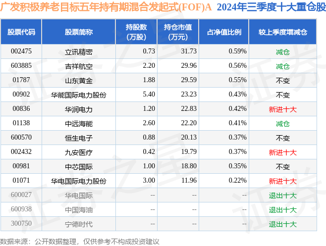 从基金规模来看,广发积极养老目标五年持有期混合发起式(FOF)A基金2024年三季度公布的基金规模为0.52亿元,较上一期规模4762.96万元变化了483.95万元,环比变化了10.16%。该基金最新一期资产配置为:股票占净值比7.49%,债券占净值比7.09%,现金占净值比1.6%。从基金持仓来看,该基金当季前十大股票仓位达4.27%,第一大重仓股为立讯精密(002475),持仓占比为0.59%。