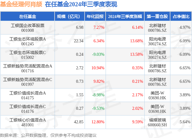 从基金规模来看,工银新趋势灵活配置混合A基金2024年三季度公布的基金规模为2.72亿元,较上一期规模2.79亿元变化了-760.15万元,环比变化了-2.72%。该基金最新一期资产配置为:股票占净值比60.68%,无债券类资产,现金占净值比59.47%。从基金持仓来看,该基金当季前十大股票仓位达35.61%,第一大重仓股为北新建材(000786),持仓占比为6.65%。