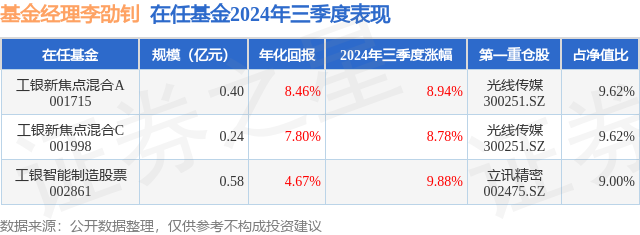 证券之星消息,日前工银新焦点混合A基金公布三季报,2024年三季度最新规模0.4亿元,季度净值涨幅为8.94%。