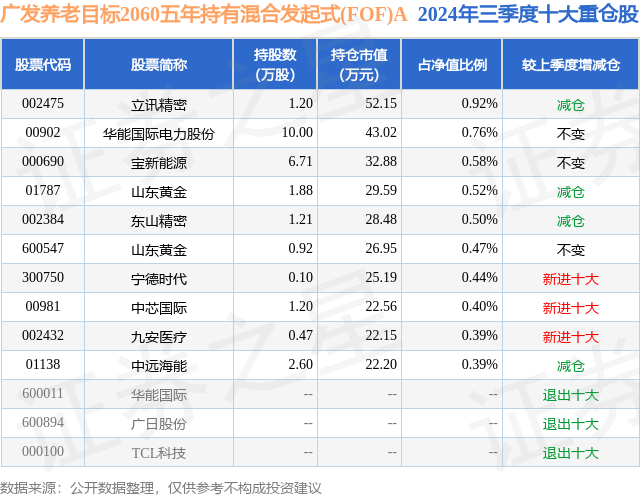 从基金规模来看,广发养老目标2060五年持有混合发起式(FOF)A基金2024年三季度公布的基金规模为0.57亿元,较上一期规模5118.53万元变化了568.16万元,环比变化了11.1%。该基金最新一期资产配置为:股票占净值比8.28%,债券占净值比4.94%,现金占净值比1.63%。从基金持仓来看,该基金当季前十大股票仓位达5.37%,第一大重仓股为立讯精密(002475),持仓占比为0.92%。