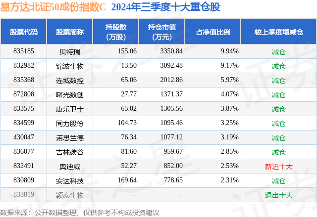 从基金规模来看,易方达北证50成份指数C基金2024年三季度公布的基金规模为2.31亿元,较上一期规模2.2亿元变化了1137.97万元,环比变化了5.18%。该基金最新一期资产配置为:股票占净值比94.8%,无债券类资产,现金占净值比4.75%。从基金持仓来看,该基金当季前十大股票仓位达47.15%,第一大重仓股为贝特瑞(835185),持仓占比为9.94%。