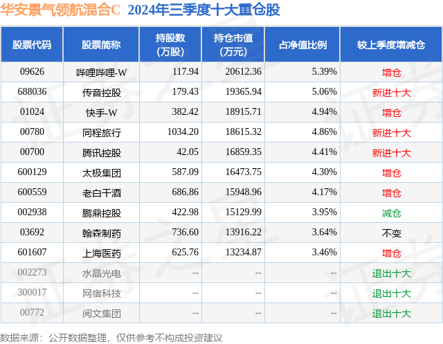 从基金规模来看,华安景气领航混合C基金2024年三季度公布的基金规模为12.72亿元,较上一期规模11.23亿元变化了1.49亿元,环比变化了13.29%。该基金最新一期资产配置为:股票占净值比92.33%,无债券类资产,现金占净值比7.97%。从基金持仓来看,该基金当季前十大股票仓位达44.18%,第一大重仓股为哔哩哔哩-W(09626),持仓占比为5.39%。