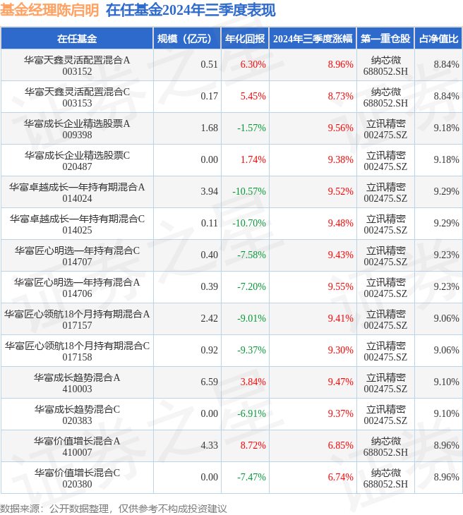 从基金规模来看,华富匠心领航18个月持有期混合A基金2024年三季度公布的基金规模为2.42亿元,较上一期规模2.21亿元变化了2094.56万元,环比变化了9.48%。该基金最新一期资产配置为:股票占净值比94.65%,无债券类资产,现金占净值比5.5%。从基金持仓来看,该基金当季前十大股票仓位达57.53%,第一大重仓股为立讯精密(002475),持仓占比为9.06%。