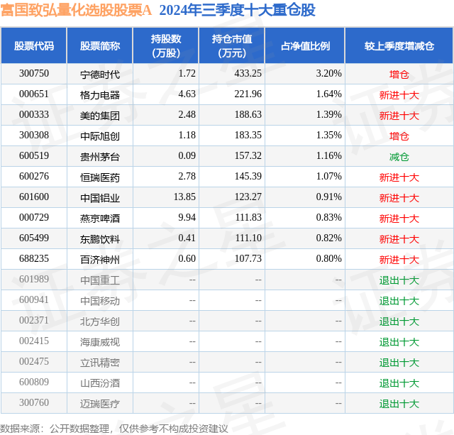 从基金规模来看,富国致弘量化选股股票A基金2024年三季度公布的基金规模为1.09亿元,较上一期规模1.01亿元变化了757.9万元,环比变化了7.5%。该基金最新一期资产配置为:股票占净值比95.03%,无债券类资产,现金占净值比5.94%。从基金持仓来看,该基金当季前十大股票仓位达13.17%,第一大重仓股为宁德时代(300750),持仓占比为3.2%。