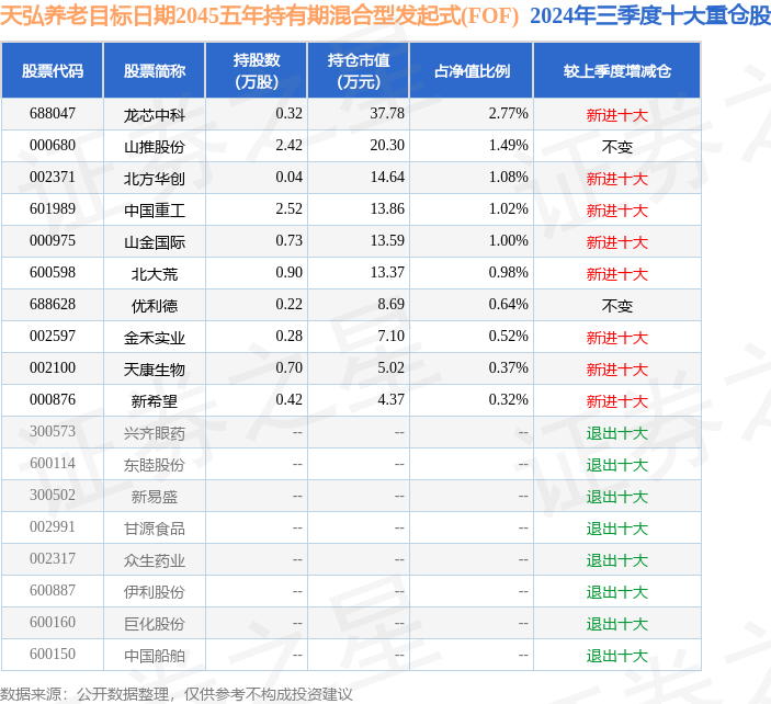 从基金规模来看,天弘养老目标日期2045五年持有期混合型发起式(FOF)基金2024年三季度公布的基金规模为0.14亿元,较上一期规模1293.07万元变化了68.29万元,环比变化了5.28%。该基金最新一期资产配置为:股票占净值比11.55%,债券占净值比4.5%,现金占净值比2.8%。从基金持仓来看,该基金当季前十大股票仓位达10.19%,第一大重仓股为龙芯中科(688047),持仓占比为2.77%。