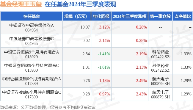 中银证券凌瑞6个月持有期混合A现任基金经理为王玉玺。其中在任基金经理王玉玺已从业7年又290天,2023年6月19日正式接手管理中银证券凌瑞6个月持有期混合A,任职期间累计回报为1.6%。目前还管理着6只基金产品(包括A类和C类),其中本季度表现最佳的基金为中银证券凌瑞6个月持有期混合A(017389),季度净值涨幅为2.49%。