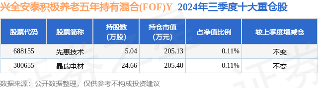从基金规模来看,兴全安泰积极养老五年持有混合(FOF)Y基金2024年三季度公布的基金规模为8.25亿元,较上一期规模7.26亿元变化了9849.17万元,环比变化了13.56%。该基金最新一期资产配置为:股票占净值比0.22%,无债券类资产,现金占净值比1.5%。从基金持仓来看,该基金当季前十大股票仓位达0.22%,第一大重仓股为先惠技术(688155),持仓占比为0.11%。