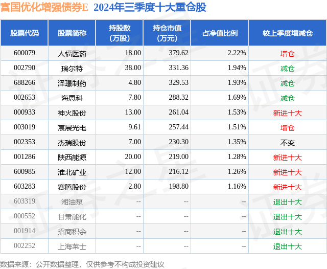 从基金规模来看,富国优化增强债券E基金2024年三季度公布的基金规模为0.0亿元,较上一期规模1.56万元变化了0.1万元,环比变化了6.61%。该基金最新一期资产配置为:股票占净值比21.63%,债券占净值比109.69%,现金占净值比2.23%。从基金持仓来看,该基金当季前十大股票仓位达15.87%,第一大重仓股为人福医药(600079),持仓占比为2.22%。