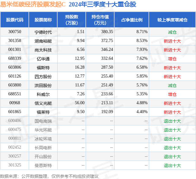 从基金规模来看,易米低碳经济股票发起C基金2024年三季度公布的基金规模为0.03亿元,较上一期规模222.86万元变化了43.99万元,环比变化了19.74%。该基金最新一期资产配置为:股票占净值比95.07%,无债券类资产,现金占净值比5.24%。从基金持仓来看,该基金当季前十大股票仓位达65.61%,第一大重仓股为宁德时代(300750),持仓占比为8.71%。