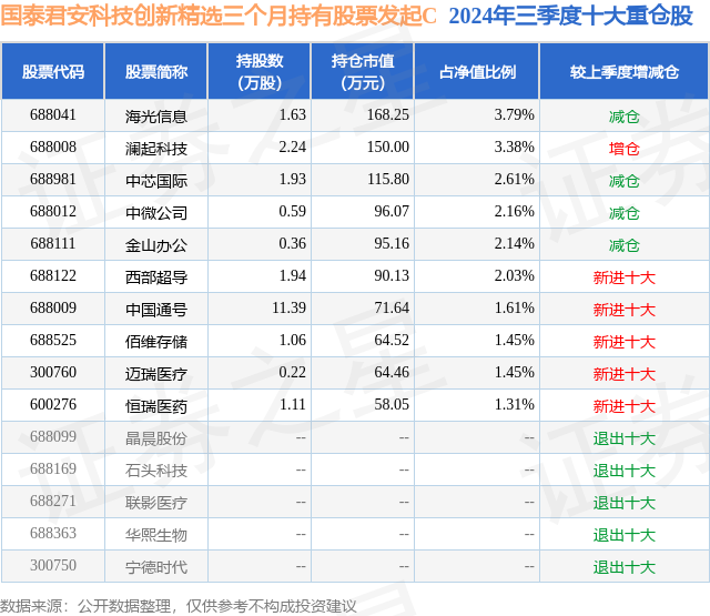 从基金规模来看,国泰君安科技创新精选三个月持有股票发起C基金2024年三季度公布的基金规模为0.12亿元,较上一期规模1670.14万元变化了-466.33万元,环比变化了-27.92%。该基金最新一期资产配置为:股票占净值比92.51%,无债券类资产,现金占净值比8.24%。从基金持仓来看,该基金当季前十大股票仓位达21.93%,第一大重仓股为海光信息(688041),持仓占比为3.79%。