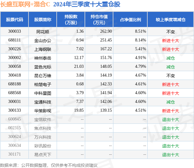 从基金规模来看,长盛互联网+混合C基金2024年三季度公布的基金规模为0.06亿元,较上一期规模492.55万元变化了67.09万元,环比变化了13.62%。该基金最新一期资产配置为:股票占净值比89.7%,无债券类资产,现金占净值比10.5%。从基金持仓来看,该基金当季前十大股票仓位达54.75%,第一大重仓股为同花顺(300033),持仓占比为8.51%。