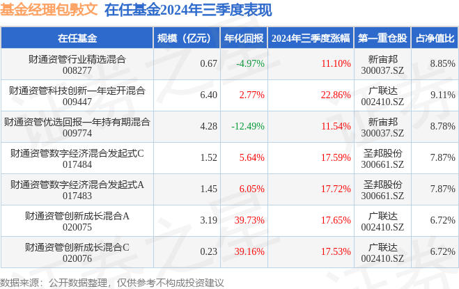 证券之星消息,日前财通资管数字经济混合发起式C基金公布三季报,2024年三季度最新规模1.52亿元,季度净值涨幅为17.59%。
