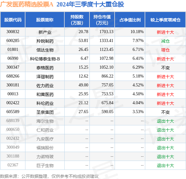 从基金规模来看,广发医药精选股票A基金2024年三季度公布的基金规模为1.34亿元,较上一期规模1.29亿元变化了432.28万元,环比变化了3.34%。该基金最新一期资产配置为:股票占净值比89.51%,债券占净值比3.64%,现金占净值比4.9%。从基金持仓来看,该基金当季前十大股票仓位达59.33%,第一大重仓股为新产业(300832),持仓占比为10.18%。