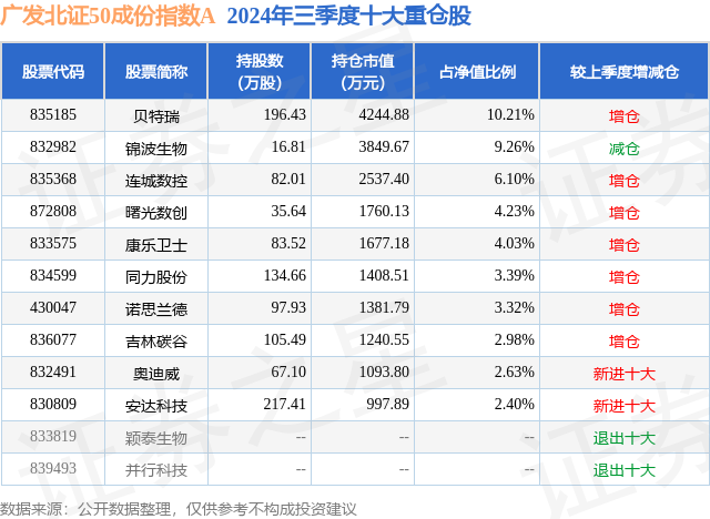 从基金规模来看,广发北证50成份指数A基金2024年三季度公布的基金规模为1.25亿元,较上一期规模8032.99万元变化了4454.43万元,环比变化了55.45%。该基金最新一期资产配置为:股票占净值比96.61%,无债券类资产,现金占净值比6.46%。从基金持仓来看,该基金当季前十大股票仓位达48.55%,第一大重仓股为贝特瑞(835185),持仓占比为10.21%。