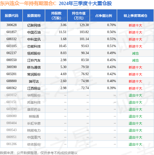 证券之星消息,日前东兴连众一年持有期混合C基金公布三季报,2024年三季度最新规模0.83亿元,季度净值涨幅为-0.34%。