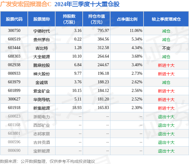 从基金规模来看,广发安宏回报混合C基金2024年三季度公布的基金规模为0.01亿元,较上一期规模53.35万元变化了7.88万元,环比变化了14.76%。该基金最新一期资产配置为:股票占净值比77.39%,无债券类资产,现金占净值比5.8%。从基金持仓来看,该基金当季前十大股票仓位达40.55%,第一大重仓股为宁德时代(300750),持仓占比为11.06%。