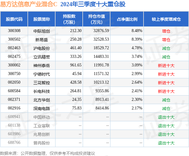 从基金规模来看,易方达信息产业混合C基金2024年三季度公布的基金规模为2.6亿元,较上一期规模7428.99万元变化了1.86亿元,环比变化了250.2%。该基金最新一期资产配置为:股票占净值比90.68%,债券占净值比0.05%,现金占净值比14.3%。从基金持仓来看,该基金当季前十大股票仓位达40.99%,第一大重仓股为中际旭创(300308),持仓占比为8.48%。