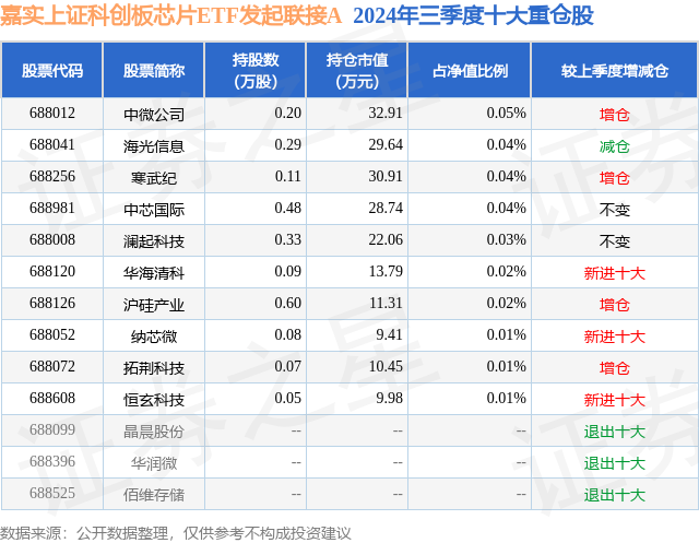 从基金规模来看,嘉实上证科创板芯片ETF发起联接A基金2024年三季度公布的基金规模为0.84亿元,较上一期规模6328.72万元变化了2079.73万元,环比变化了32.86%。该基金最新一期资产配置为:股票占净值比0.43%,无债券类资产,现金占净值比5.62%。从基金持仓来看,该基金当季前十大股票仓位达0.27%,第一大重仓股为中微公司(688012),持仓占比为0.05%。