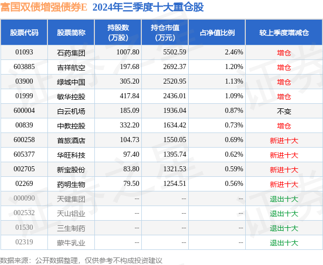 从基金规模来看,富国双债增强债券E基金2024年三季度公布的基金规模为3.9亿元,较上一期规模3.34亿元变化了5606.8万元,环比变化了16.78%。该基金最新一期资产配置为:股票占净值比20.42%,债券占净值比85.71%,现金占净值比2.79%。从基金持仓来看,该基金当季前十大股票仓位达9.94%,第一大重仓股为石药集团(01093),持仓占比为2.46%。