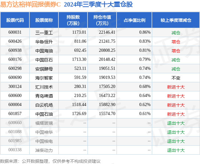 从基金规模来看,易方达裕祥回报债券C基金2024年三季度公布的基金规模为5.12亿元,较上一期规模17.99亿元变化了-12.87亿元,环比变化了-71.54%。该基金最新一期资产配置为:股票占净值比19.89%,债券占净值比82.49%,现金占净值比0.28%。从基金持仓来看,该基金当季前十大股票仓位达7.32%,第一大重仓股为三一重工(600031),持仓占比为0.86%。