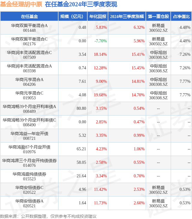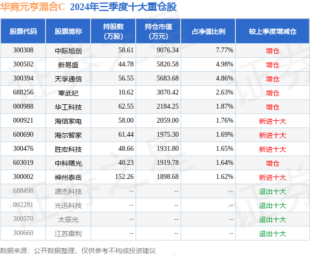 从基金规模来看,华商元亨混合C基金2024年三季度公布的基金规模为4.08亿元,较上一期规模9498.62万元变化了3.13亿元,环比变化了329.22%。该基金最新一期资产配置为:股票占净值比80.43%,债券占净值比11.51%,现金占净值比1.66%。从基金持仓来看,该基金当季前十大股票仓位达30.47%,第一大重仓股为中际旭创(300308),持仓占比为7.77%。