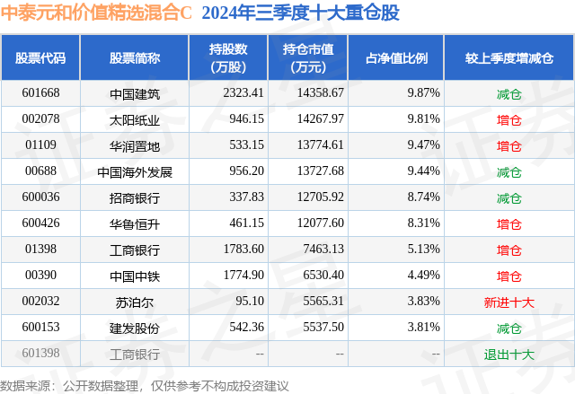从基金规模来看,中泰元和价值精选混合C基金2024年三季度公布的基金规模为3.19亿元,较上一期规模2.48亿元变化了7057.7万元,环比变化了28.41%。该基金最新一期资产配置为:股票占净值比90.83%,无债券类资产,现金占净值比8.69%。从基金持仓来看,该基金当季前十大股票仓位达72.9%,第一大重仓股为中国建筑(601668),持仓占比为9.87%。