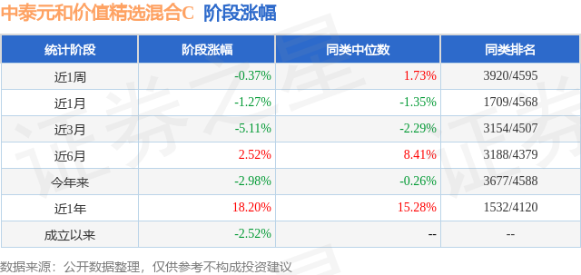 从业绩表现来看,中泰元和价值精选混合C基金过去一年净值涨幅为12.08%,在同类基金中排名845/3979,同类基金过去一年净值涨幅中位数为5.4%。而基金过去一年的最大回撤为-20.82%,成立以来的最大回撤为-20.82%。