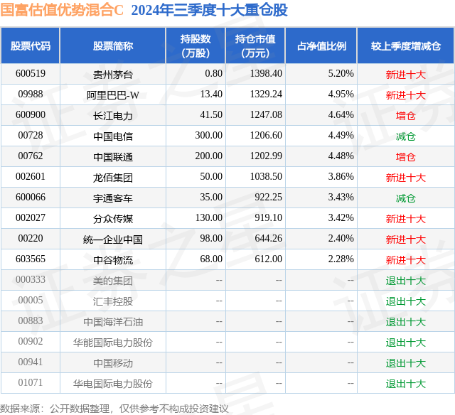 从基金规模来看,国富估值优势混合C基金2024年三季度公布的基金规模为0.29亿元,较上一期规模2926.16万元变化了-49.9万元,环比变化了-1.71%。该基金最新一期资产配置为:股票占净值比80.89%,债券占净值比5.67%,现金占净值比35.45%。从基金持仓来看,该基金当季前十大股票仓位达39.15%,第一大重仓股为贵州茅台(600519),持仓占比为5.2%。