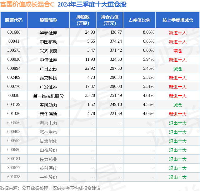 从基金规模来看,富国价值成长混合C基金2024年三季度公布的基金规模为0.04亿元,较上一期规模491.06万元变化了-51.91万元,环比变化了-10.57%。该基金最新一期资产配置为:股票占净值比81.38%,无债券类资产,现金占净值比24.36%。从基金持仓来看,该基金当季前十大股票仓位达56.93%,第一大重仓股为华泰证券(601688),持仓占比为8.03%。