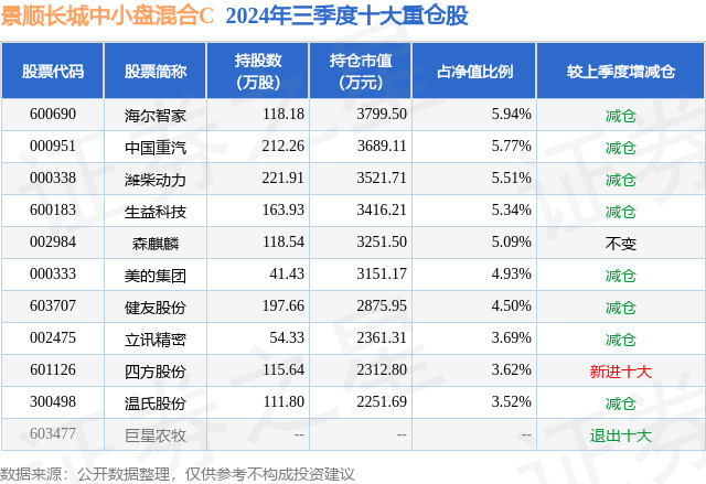 证券之星消息,日前景顺长城中小盘混合C基金公布三季报,2024年三季度最新规模0.36亿元,季度净值涨幅为7.47%。