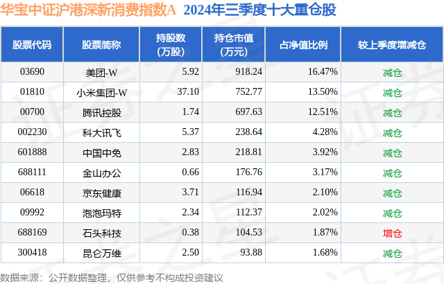 从基金规模来看,华宝中证沪港深新消费指数A基金2024年三季度公布的基金规模为0.24亿元,较上一期规模1825.75万元变化了538.44万元,环比变化了29.49%。该基金最新一期资产配置为:股票占净值比88.84%,无债券类资产,现金占净值比11.59%。从基金持仓来看,该基金当季前十大股票仓位达61.52%,第一大重仓股为美团-W(03690),持仓占比为16.47%。