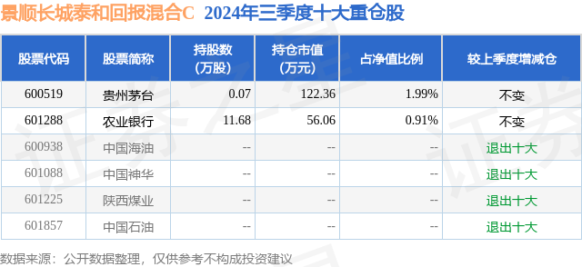 从基金规模来看,景顺长城泰和回报混合C基金2024年三季度公布的基金规模为0.0亿元,较上一期规模52.27万元变化了-16.53万元,环比变化了-31.62%。该基金最新一期资产配置为:股票占净值比2.91%,债券占净值比92.46%,现金占净值比4.9%。从基金持仓来看,该基金当季前十大股票仓位达2.9%,第一大重仓股为贵州茅台(600519),持仓占比为1.99%。