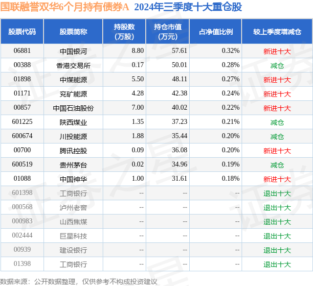 从基金规模来看,国联融誉双华6个月持有债券A基金2024年三季度公布的基金规模为0.51亿元,较上一期规模1.0亿元变化了-4939.43万元,环比变化了-49.17%。该基金最新一期资产配置为:股票占净值比7.08%,债券占净值比120.54%,现金占净值比1.35%。从基金持仓来看,该基金当季前十大股票仓位达2.31%,第一大重仓股为中国银河(06881),持仓占比为0.32%。