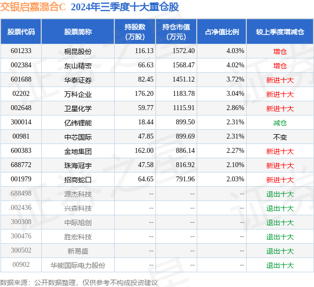 从基金规模来看,交银启嘉混合C基金2024年三季度公布的基金规模为1.73亿元,较上一期规模1.62亿元变化了1120.62万元,环比变化了6.92%。该基金最新一期资产配置为:股票占净值比91.73%,债券占净值比2.51%,现金占净值比8.13%。从基金持仓来看,该基金当季前十大股票仓位达28.69%,第一大重仓股为桐昆股份(601233),持仓占比为4.03%。