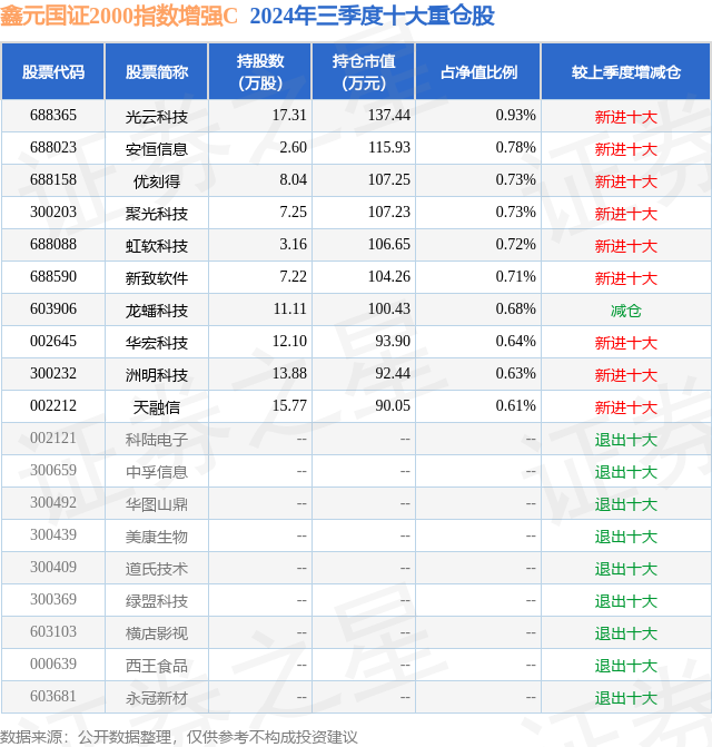 从基金规模来看,鑫元国证2000指数增强C基金2024年三季度公布的基金规模为0.8亿元,较上一期规模7405.99万元变化了573.05万元,环比变化了7.74%。该基金最新一期资产配置为:股票占净值比92.59%,债券占净值比6.0%,现金占净值比1.48%。从基金持仓来看,该基金当季前十大股票仓位达7.16%,第一大重仓股为光云科技(688365),持仓占比为0.93%。